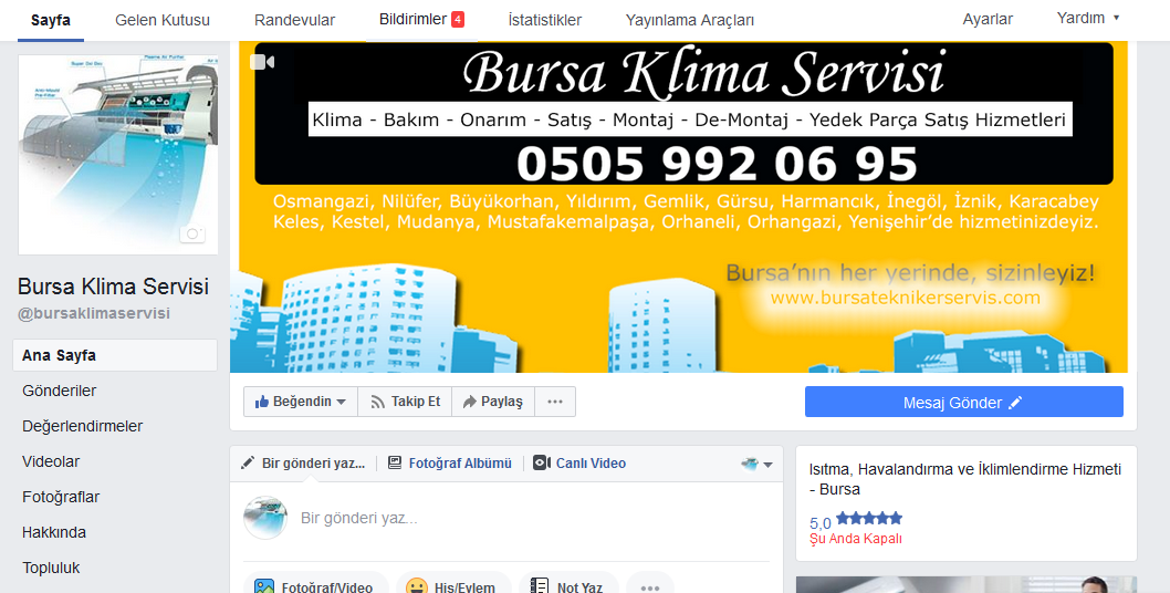 Bursa klima servisimizin facebook sayfasına https://www.facebook.com/bursaklimaservisi adresi üzerinden ulaşım sağlayabilirsiniz. Bursa klima servisi temel olarak klimanızın arıza onarım işlemleri, bakım, montaj, demontaj, yedek parça satış ile ilgili ihtiyaçlarınız için anında çözüm üretmeyi hedeflemiştir. Bursa klima servisimiz temel olarak Nilüfer ilçesi başta olmak üzere Osmangazi, Yıldırım, Büyükorhan, Gemlik, Gürsu, Harmancık, İnegöl, İznik, Karacabey, Keles, Kestel, Mudanya, Mustafakemalpaşa, Orhaneli, Orhangazi ve Yenişehir’den gelecek taleplere hızlı çözümler sunmaktadır. Merkez ilçeler başta olmak üzere diğer tüm ilçelere de servis talebiniz doğrultusunda hizmet götürüyoruz. Bursa’nın her yerinde sizinle olan Bursa Tekniker Servis, Klima sektöründe Bursa’nın klima servisi olarak da bilinmektedir. Isıtma, Havalandırma ve İklimlendirme hizmetleri sunmakta olan teknik servisimiz sizler için faaliyet gösterir. 0505 992 06 95 numaralı telefon hattı üzerinden bize ulaşabilir ve ekonomik fiyat politikalarımızdan yararlanabilirsiniz.